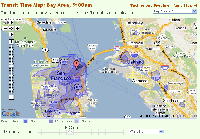 A transit time map shows how far you can travel on public transit from a given location in a certain amount of time. This map is a baby step towards helping you find a walkable, transit-friendly place to live so that you can ditch the zero (your car) and get with the hero (your new walkable condo near a light rail stop).